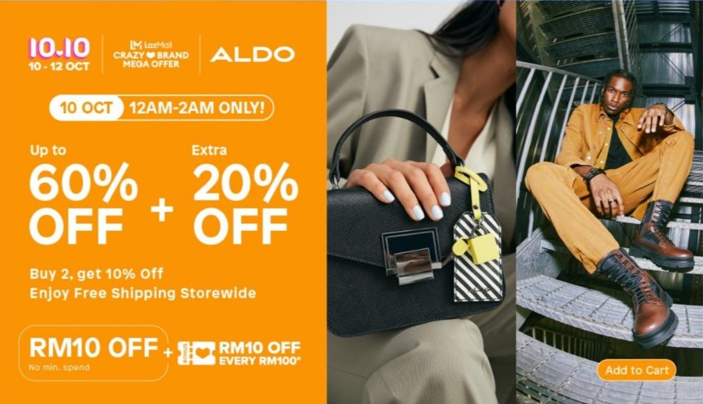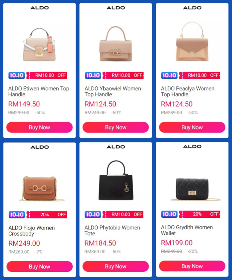 ALDO 是来自加拿大蒙特利尔的时尚品牌!在10月10日当天包包享有高达73%折扣,以及特别推出RM99 以内特价包包哦!