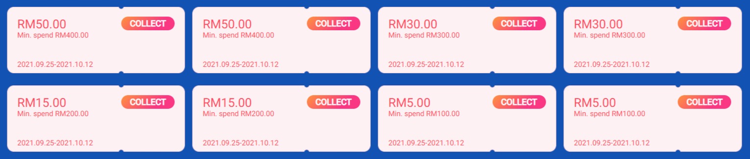 • 消费RM400,折扣RM50(即日起至10月12日)
