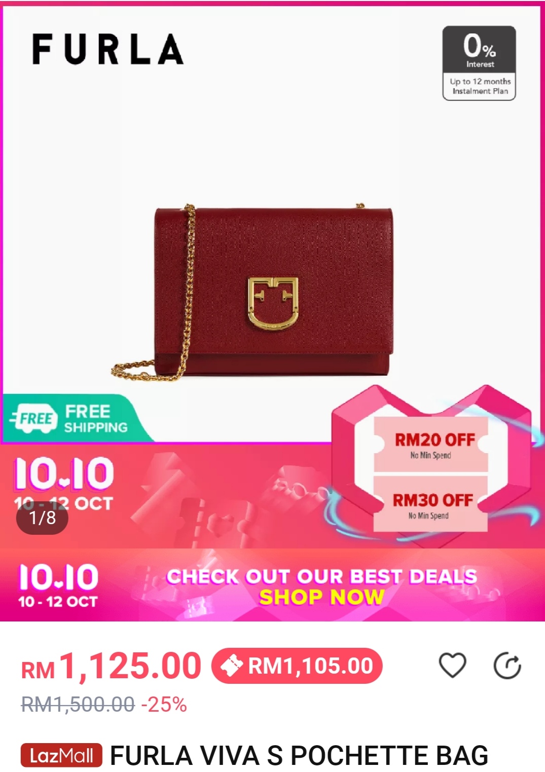 ▼ 例如:这款FURLA VIVA S POCHETTE BAG(原价RM1500)折扣25% +店家折扣券,只需RM1105!