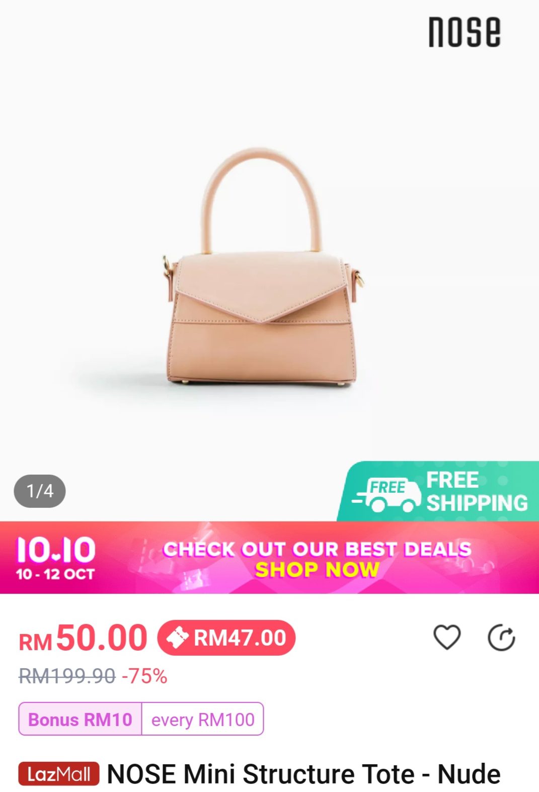 ▼ 例如:这款NOSE Mini Structure Tote – Nude(原价RM199)折扣75%+ 店家折扣券,只需RM47!