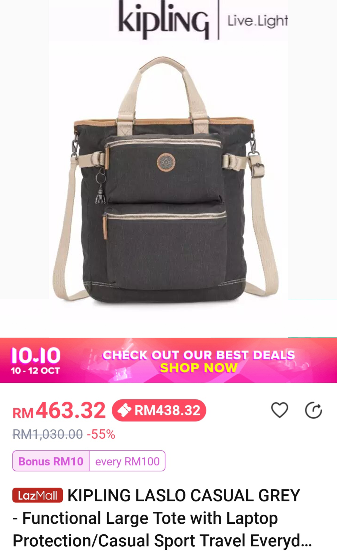 ▼ 例如:这款KIPLING LASLO CASUAL GREY – Functional Large Tote with Laptop Protection(原价RM1030)折扣55% + 店家折扣券,只需RM438.32!