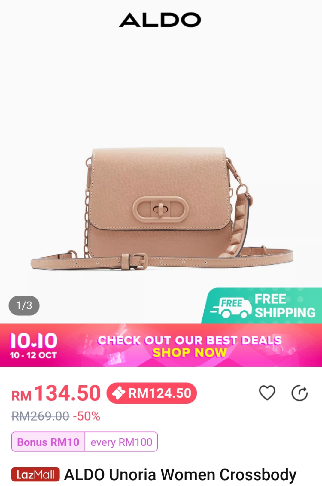 ▼ 例如:这款ALDO Unoria Women Crossbody(原价RM269)折扣50% + 店家折扣券,只需RM124.50!