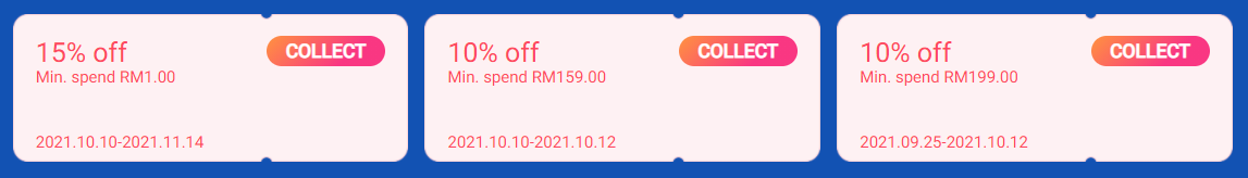• 消费RM1,折扣15%(仅限10月10日至11月14日)
