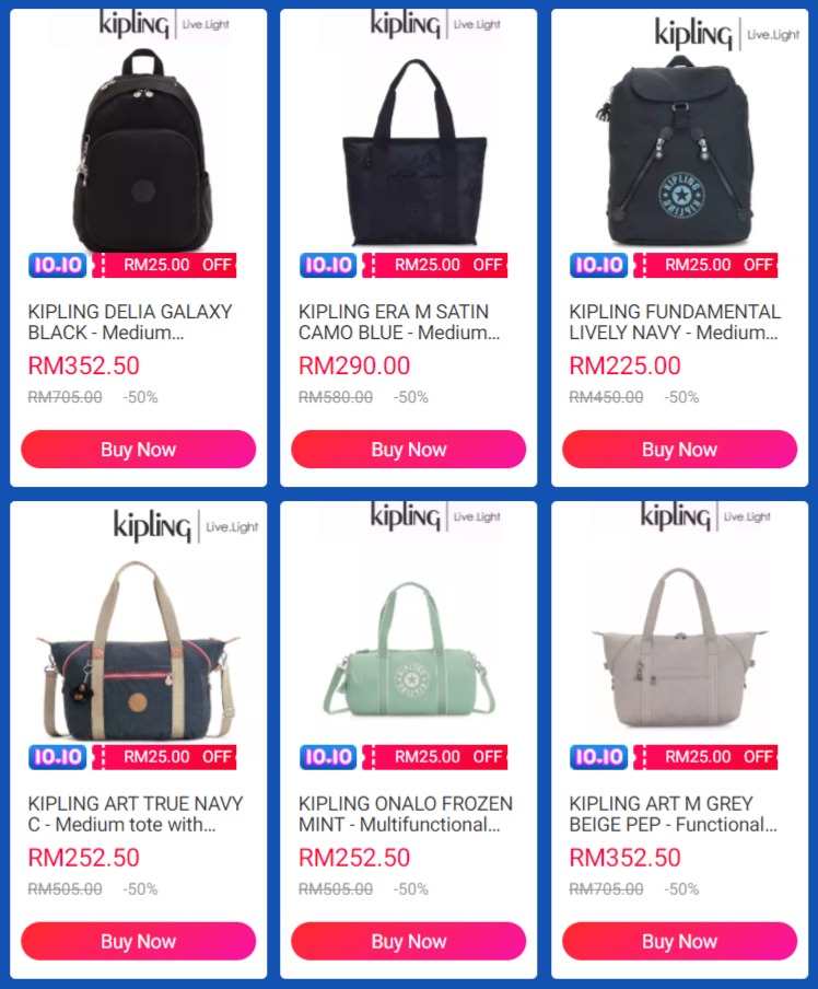 Kipling 是来自比利时的休闲箱包品牌!为了配合10.10 促销日,Kipling 休闲包折扣高达55%折扣,另外还可领取RM25 折扣券!