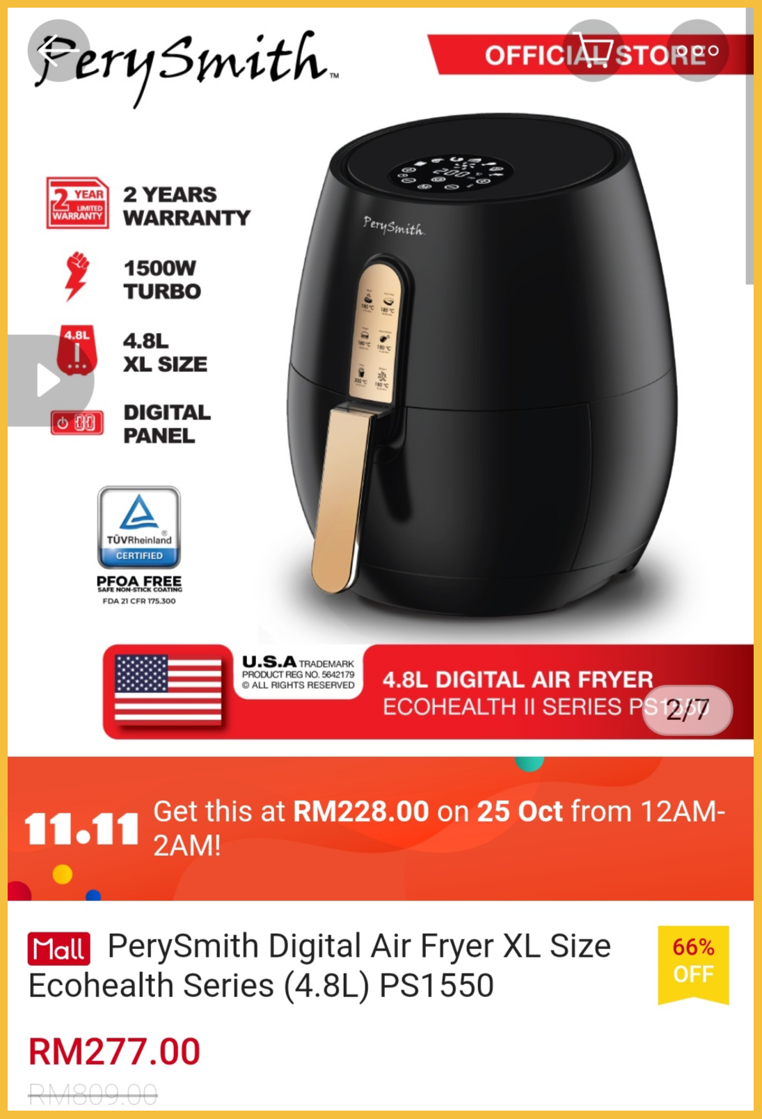 ① PerySmith 4.8L Digital Air Fryer [XL Size] Ecohealth Series PS1550