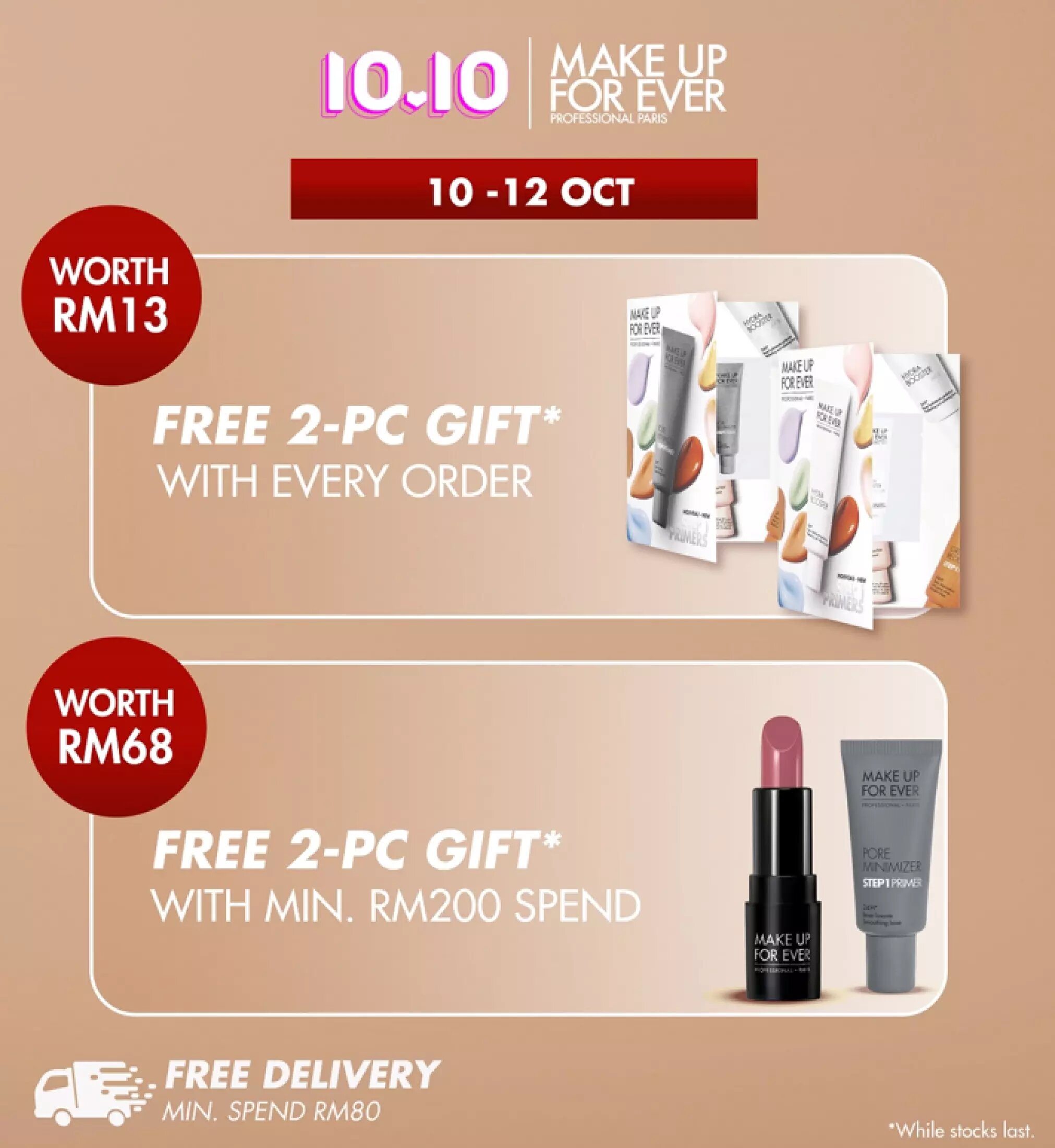 ▼ 在10月10日至12日期间,消费指定数额免费送出赠品!消费最低RM80 可享免邮服务!
