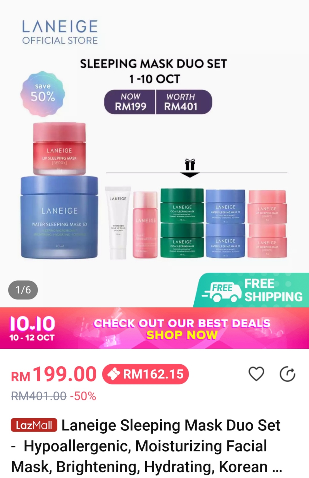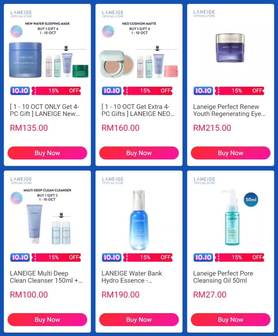 ▼ 例如:Laneige Sleeping Mask Duo Set(附送赠品)领取折扣券后,只需缴付RM162.15(原价RM401;省下RM238.85);购买【点击这里】