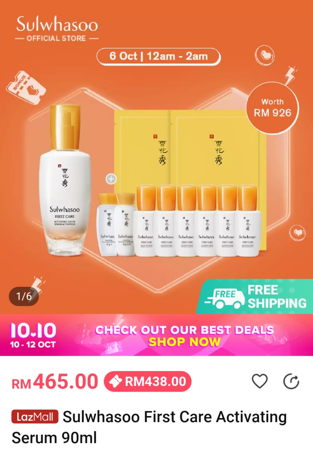 ▼ 例如:一瓶Sulwhasoo First Care Activating Serum 90ml(附送赠品)领取折扣券后,只需缴付RM438(原价RM465;省下RM27);购买【点击这里】