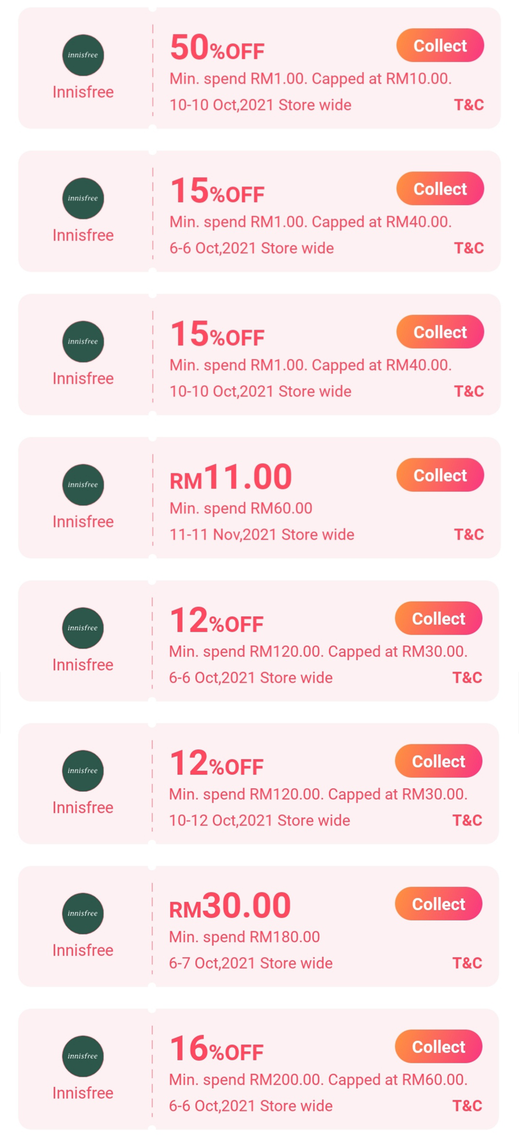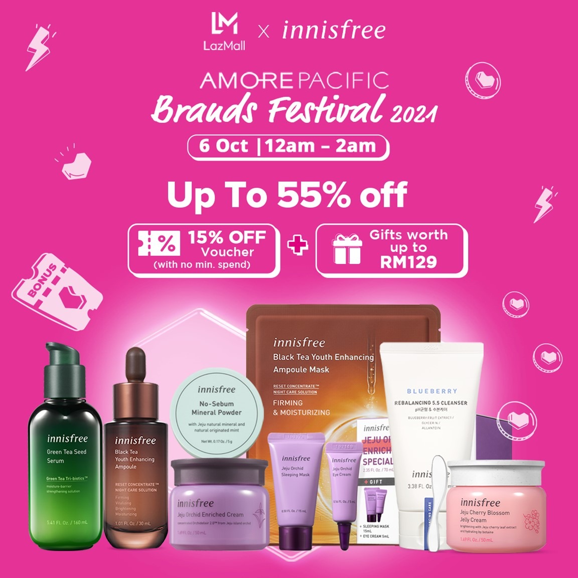 6)Innisfree —— 折扣高达55%+ 15%折扣券 + 可获价值RM129 赠品