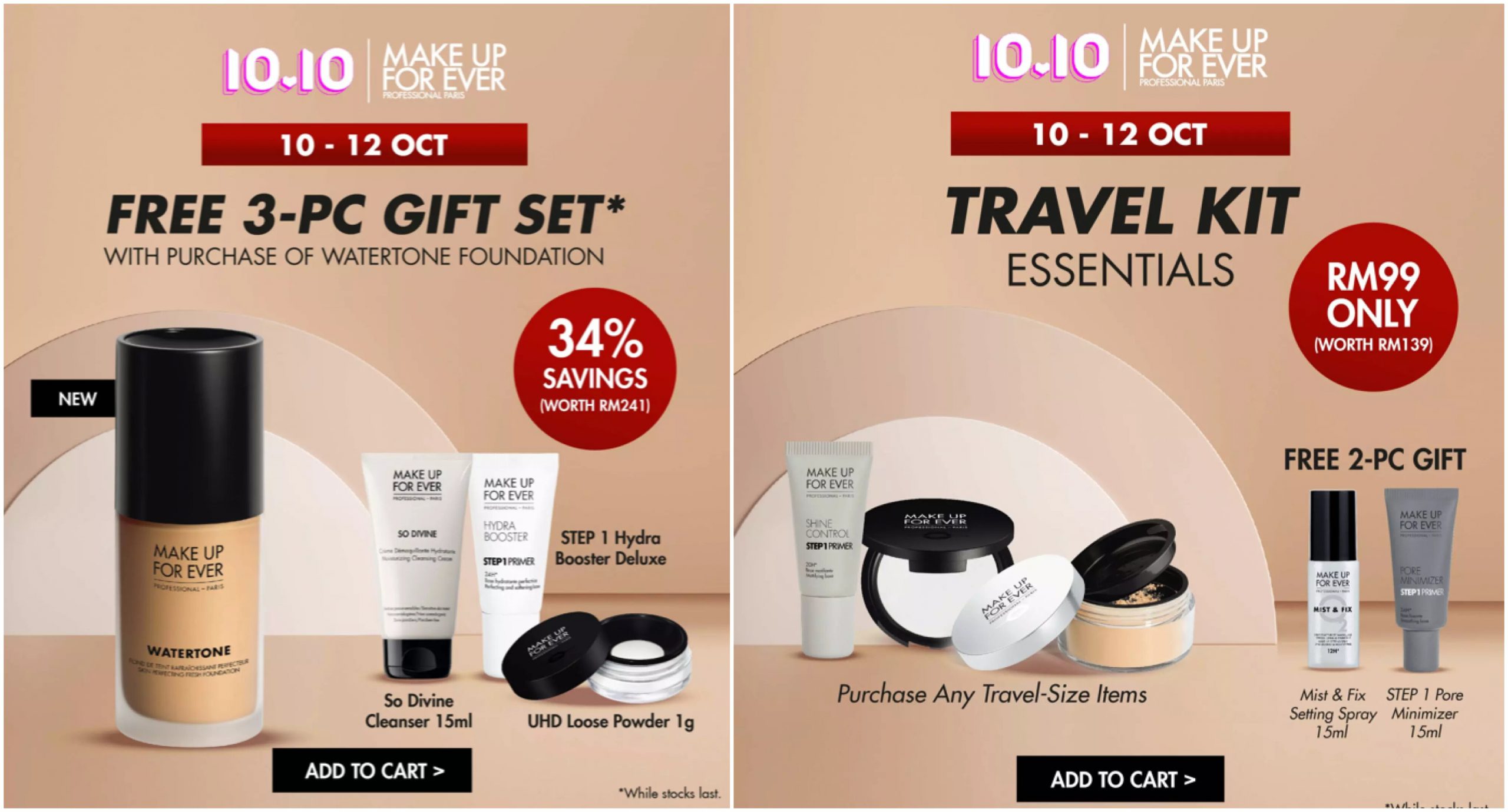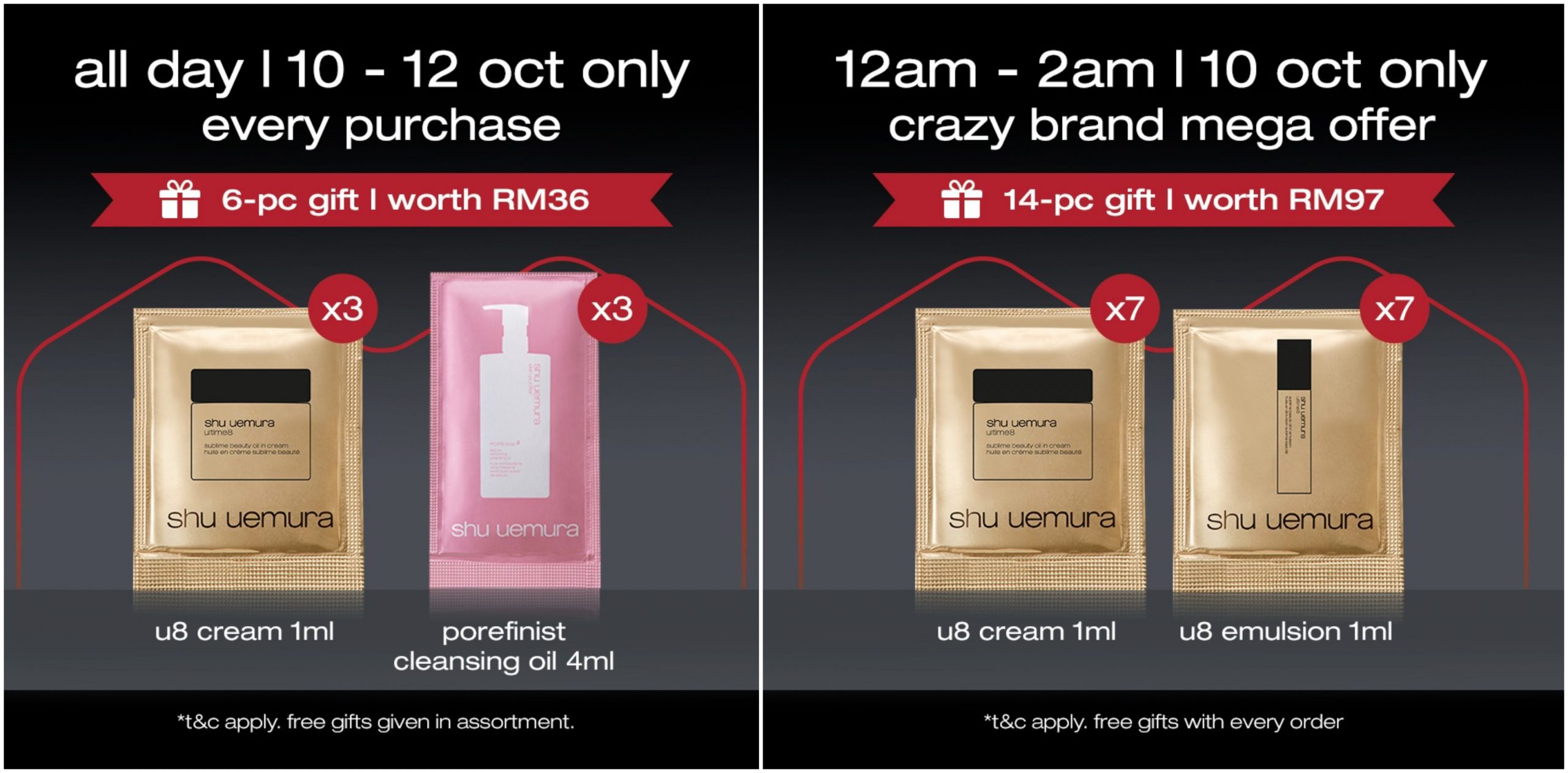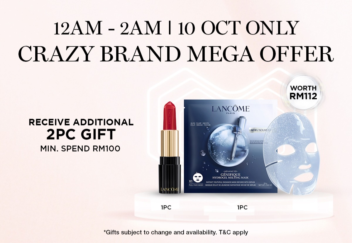 ▼ 10月10日当天的凌晨12am 至2am 推出疯狂大优惠!消费RM100 或以上免费送出2样赠品(价值RM112)