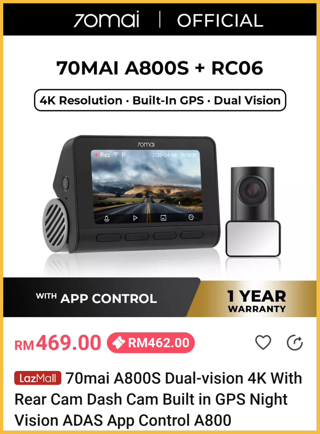 ▼③ 70mai A800S Dual-vision 4K With Rear Cam Dash Cam