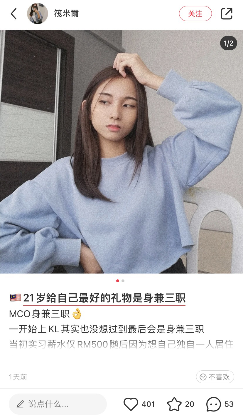 就像这位大马女孩独自人从新山来到吉隆坡这个大都市实习工作,刚满21岁的她自称,今年送给自己的最好礼物是身兼3份工作。