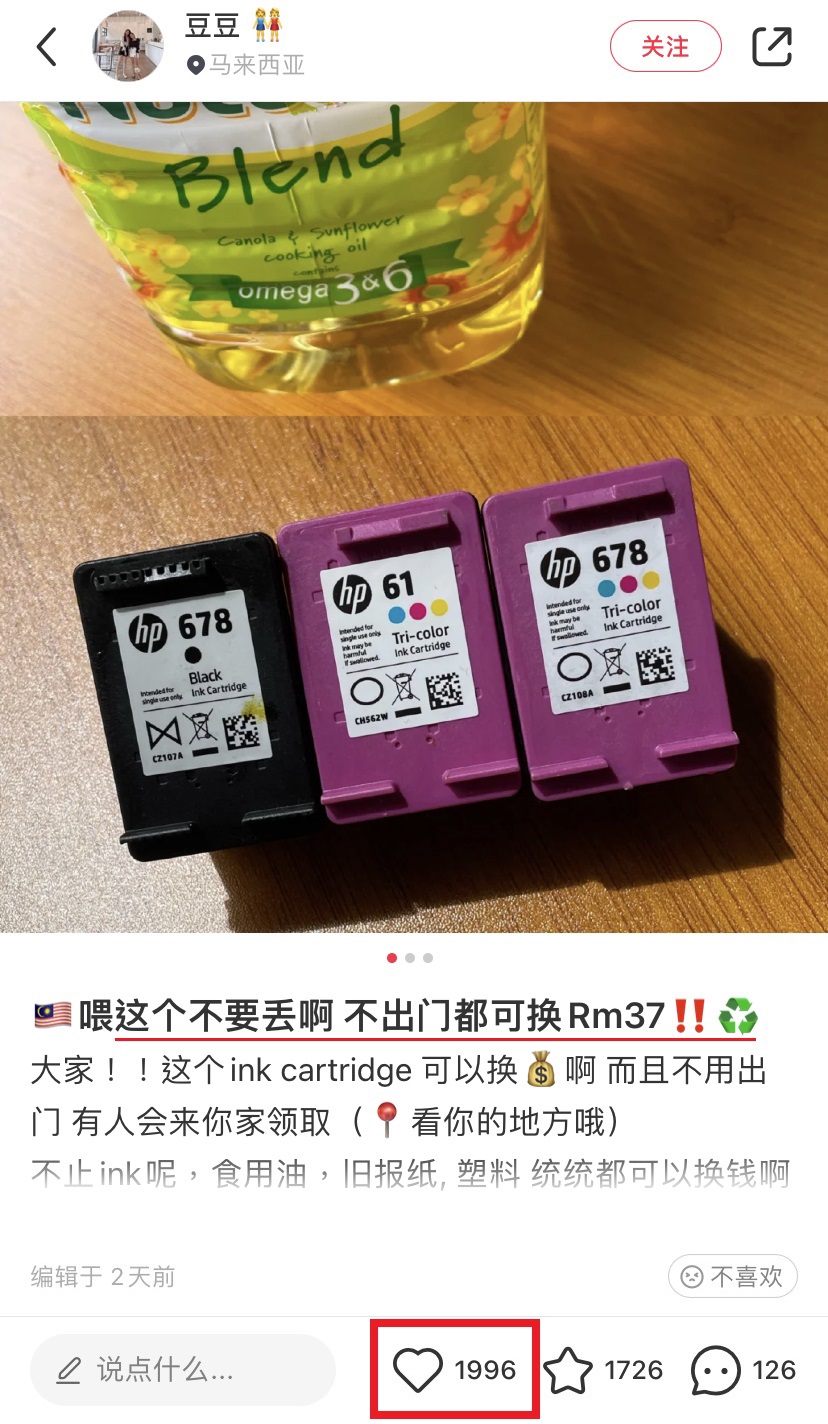 大家!!这个 ink cartridge 可以换钱啊!而且不用出门,有人会来你家领取(看你的地方哦)。不止 ink 呢,食用油、旧报纸、塑料统统都可以换钱啊!