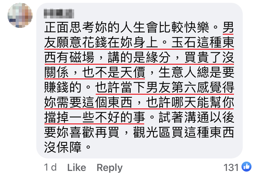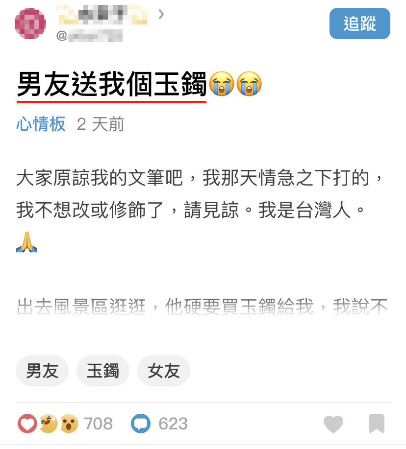 一名台湾女网友近日在 Dcard 发文,和男友逛街的时候男友买了一个六百多块的玉镯送给她,女友当下就说了不要但男友坚持要买。