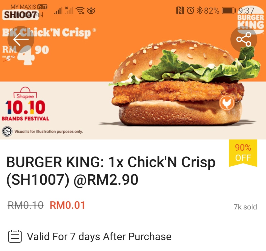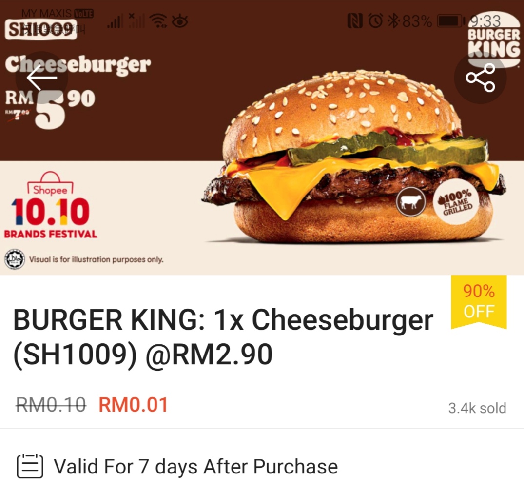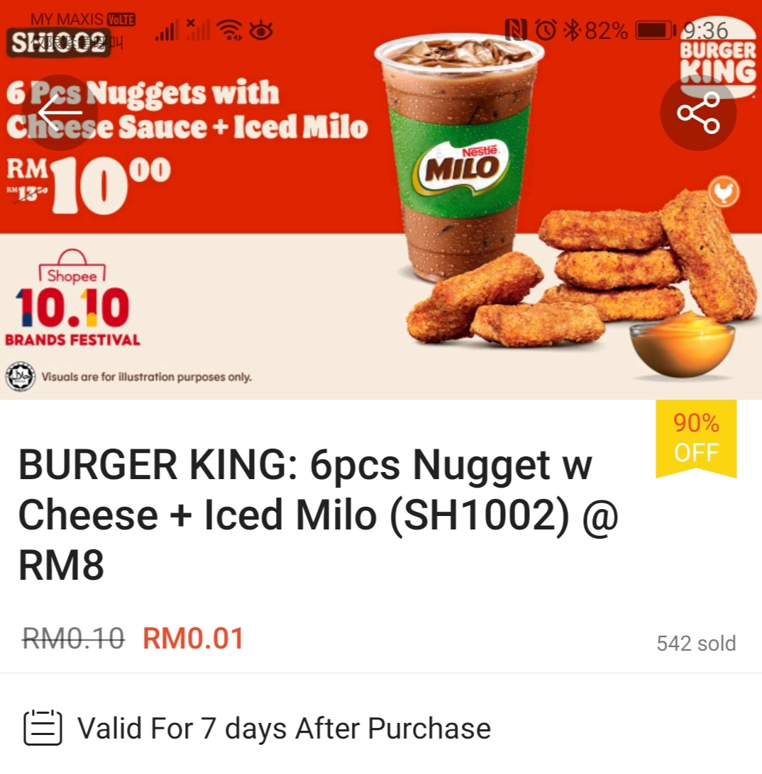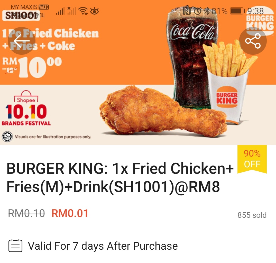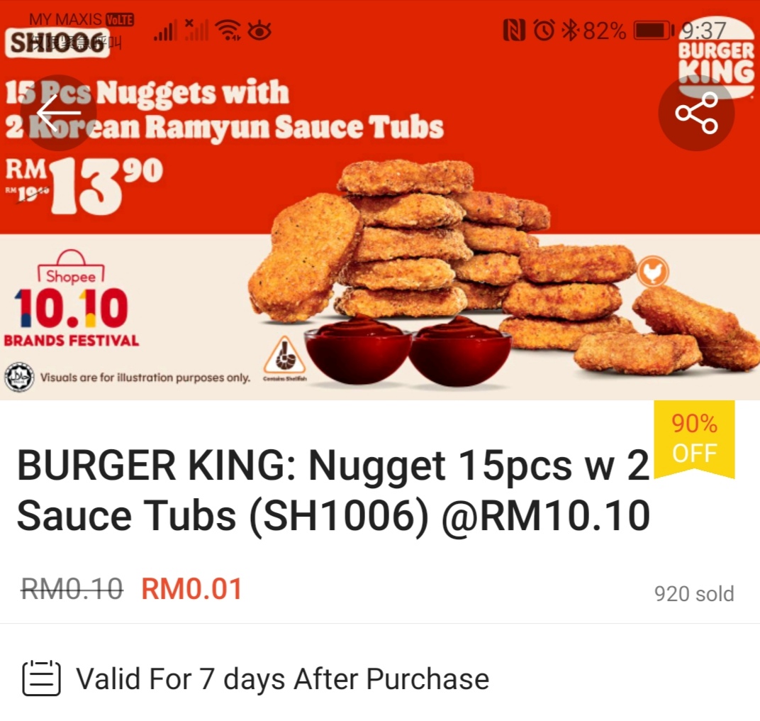 这项优惠从即日起至10月12日,你可通过Shopee 购买Burger King 10.10 超值套餐!一粒汉堡只需RM2.90,15块Nuggets 只需RM10.10!