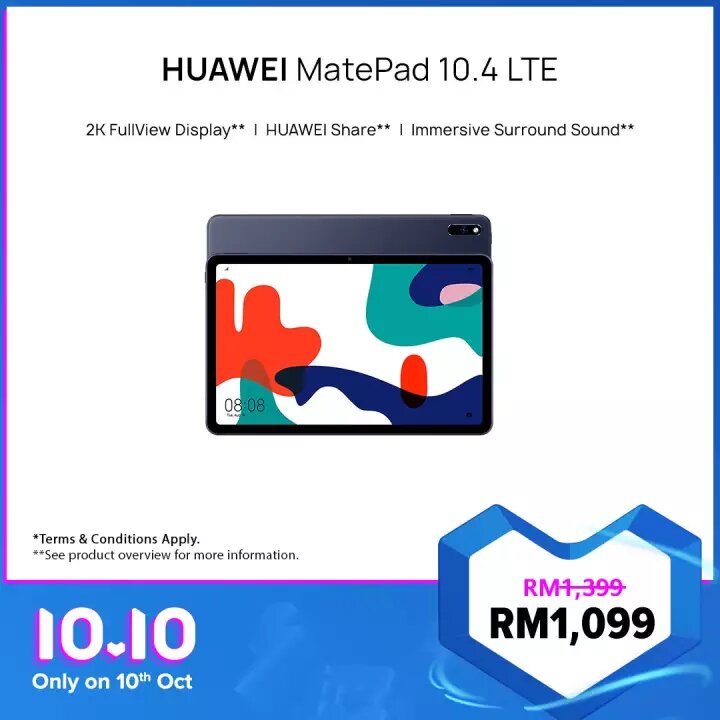 ▼ HUAWEI MatePad 10.4 Tablet LTE (4GB RAM + 64GB ROM) – RM1099(原价RM1399;省下RM300)