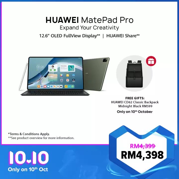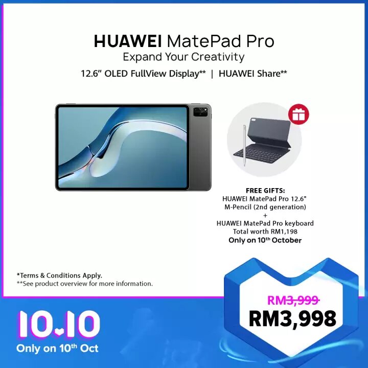 附送赠品:Huawei Matepad Pro 12.6″ M-Pencil + Matepad Pro Keyboard(价值RM1198)