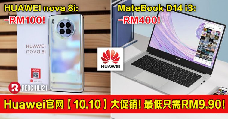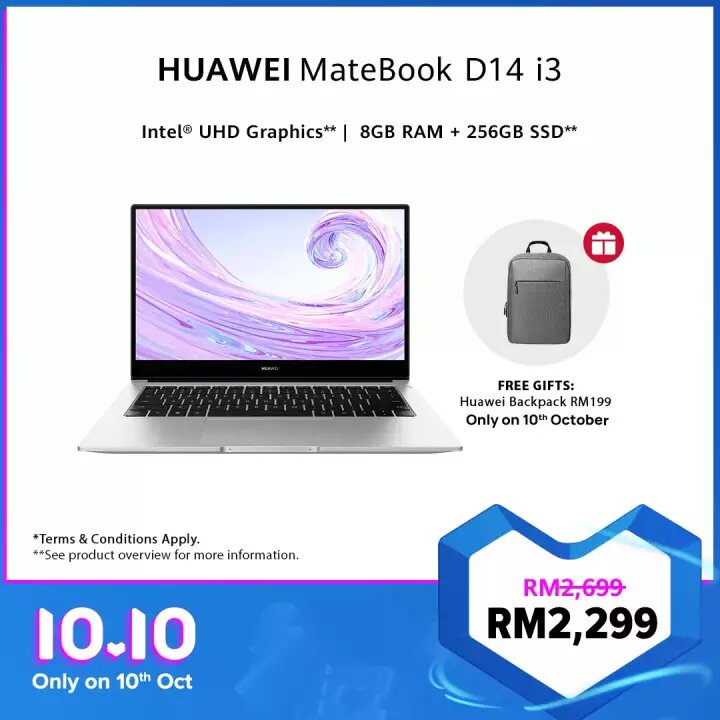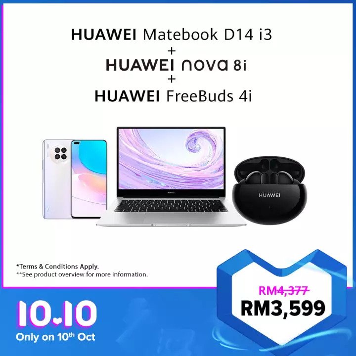 ▼ HUAWEI MateBook D14 i3 Laptop + Huawei Nova 8i+Freebuds 4i + Free CD60 Backpack – 只需RM3599(原价RM4377;省下RM778)
