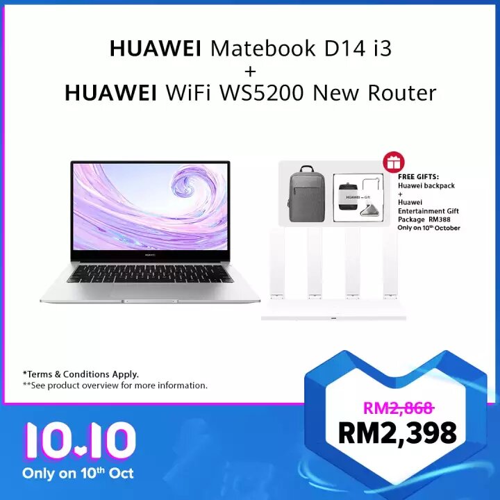 ▼ HUAWEI MateBook D14 i3 Laptop +HUAWEI WiFi WS5200 New Router – 只需RM2398(原价RM2868;省下RM470)