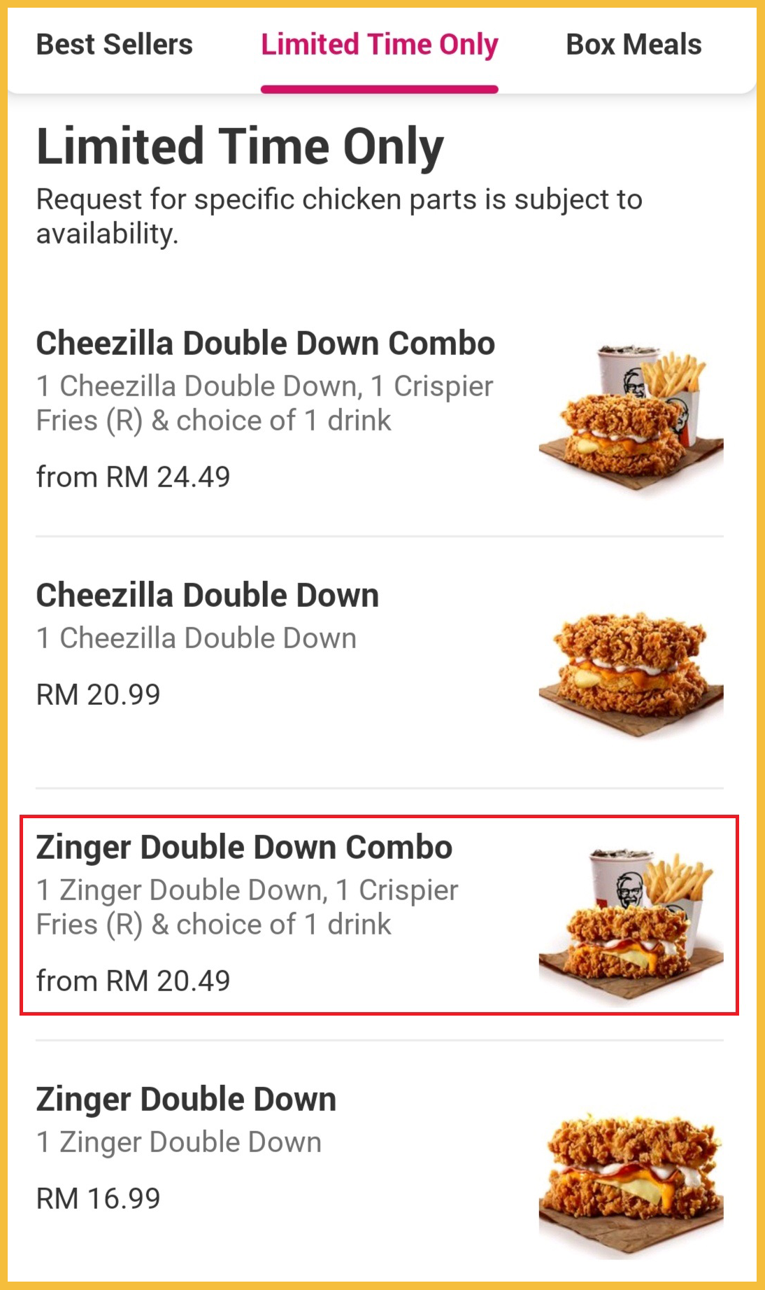 步骤2:选择你想吃早餐。例如:Zinger Double Down Combo。