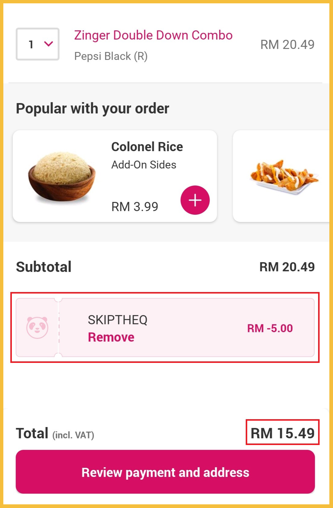 ※ 1份Zinger Double Down Combo 原价RM20.49,折扣【SKIPTHEQ】RM5之后,只需RM15.49!