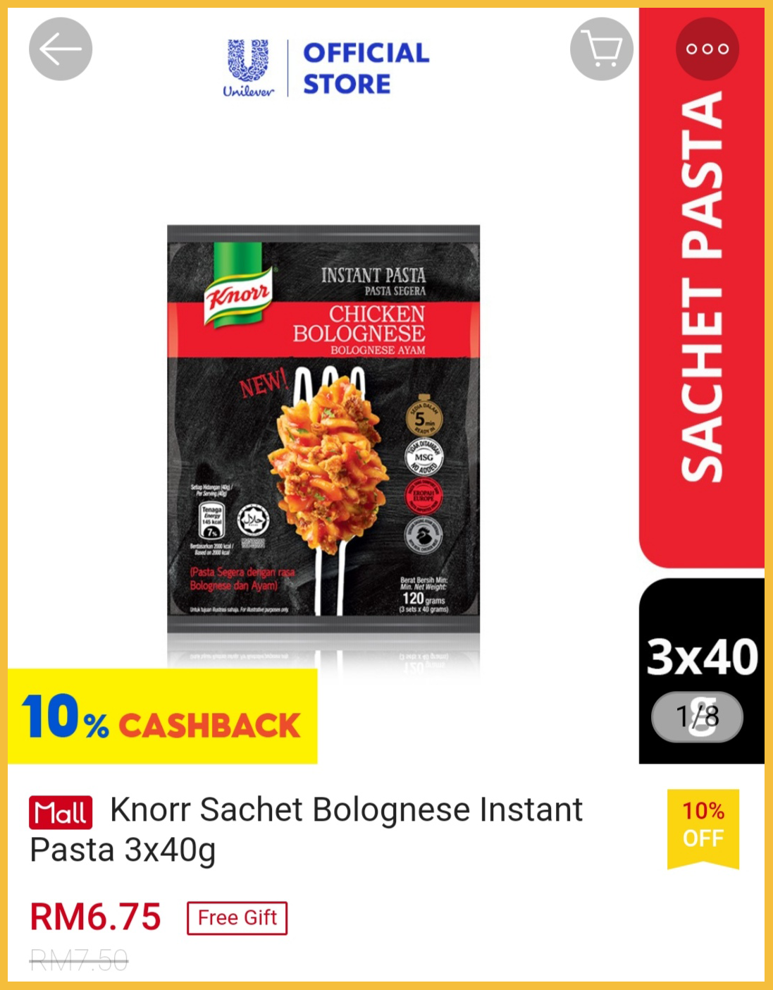 ▼ Knorr Sachet Bolognese Instant Pasta 3x40g – RM6.75;购买【点击这里】