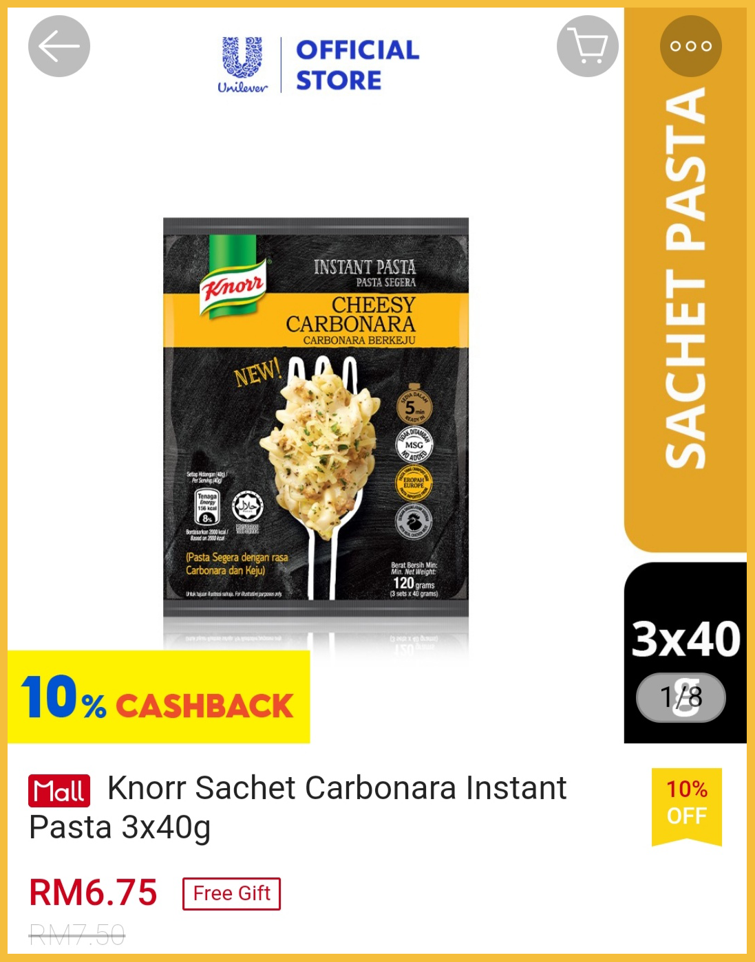 ▼ Knorr Sachet Carbonara Instant Pasta 3x40g – RM6.75;购买【点击这里】