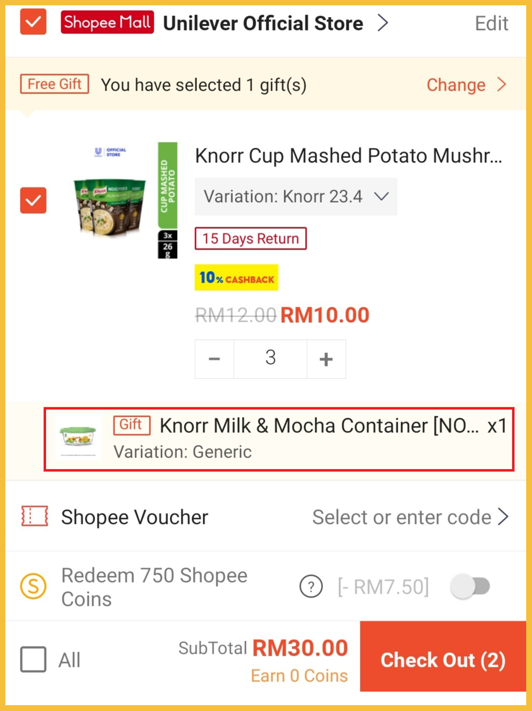 ▼ 把你想购买Knorr 即食品加进购物车后,赠品将会自动显示在付款页面!