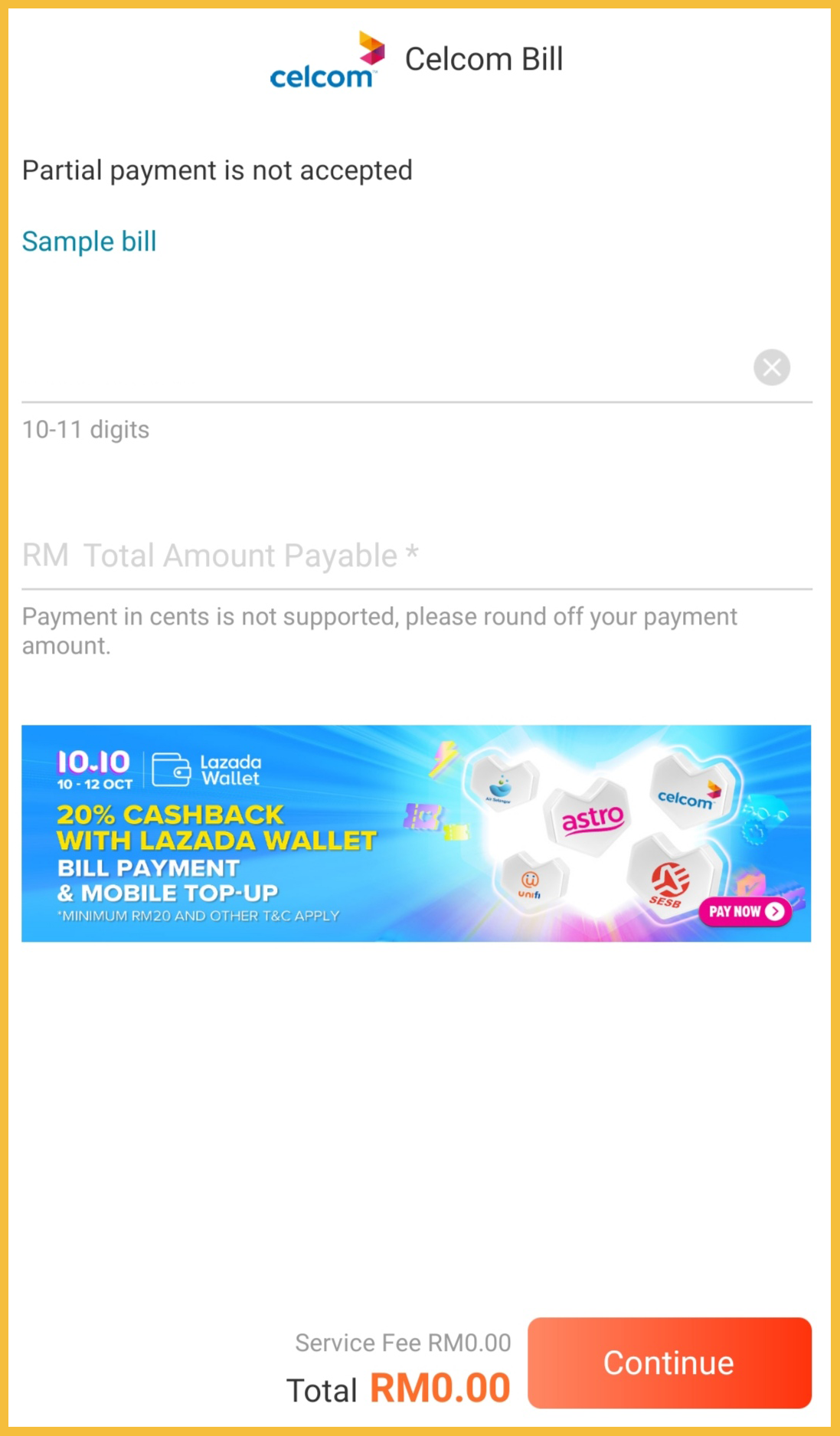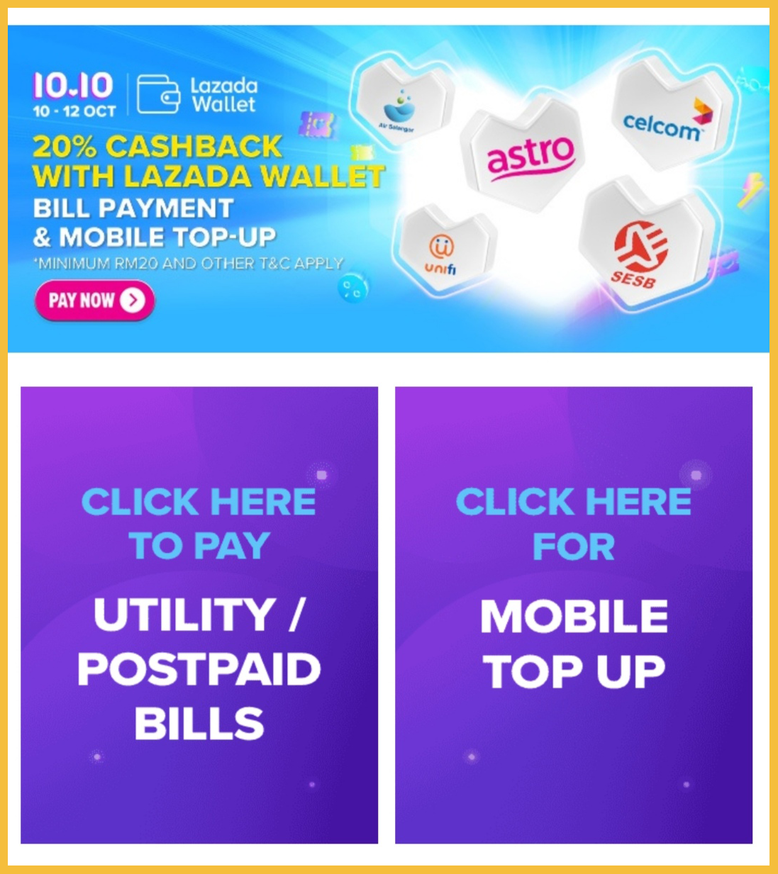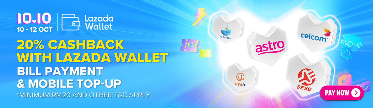 这项优惠将从10月10日至10月12日,大马网购平台Lazada 推出缴付账单可获得10%回扣!最低缴付RM20 可获高达RM5 回扣!