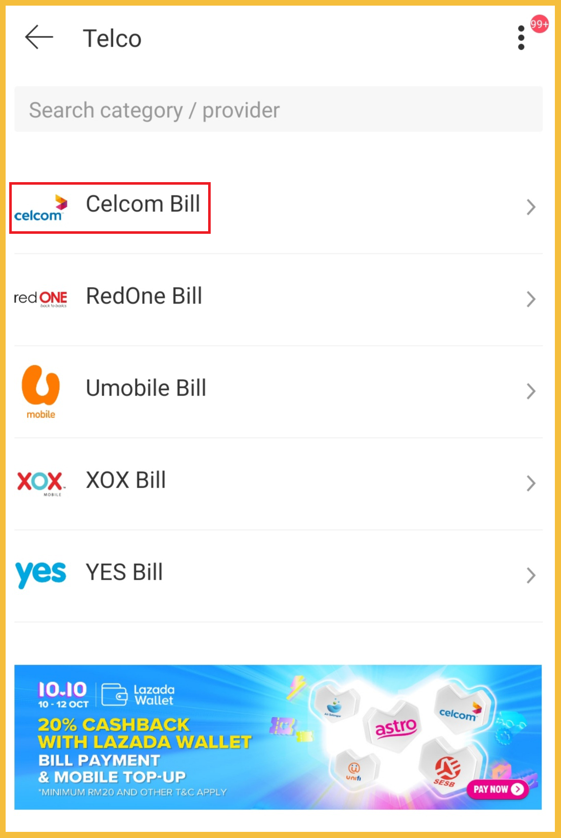 步骤4:选择你的电讯公司。比如:选择“Celcom Bill”