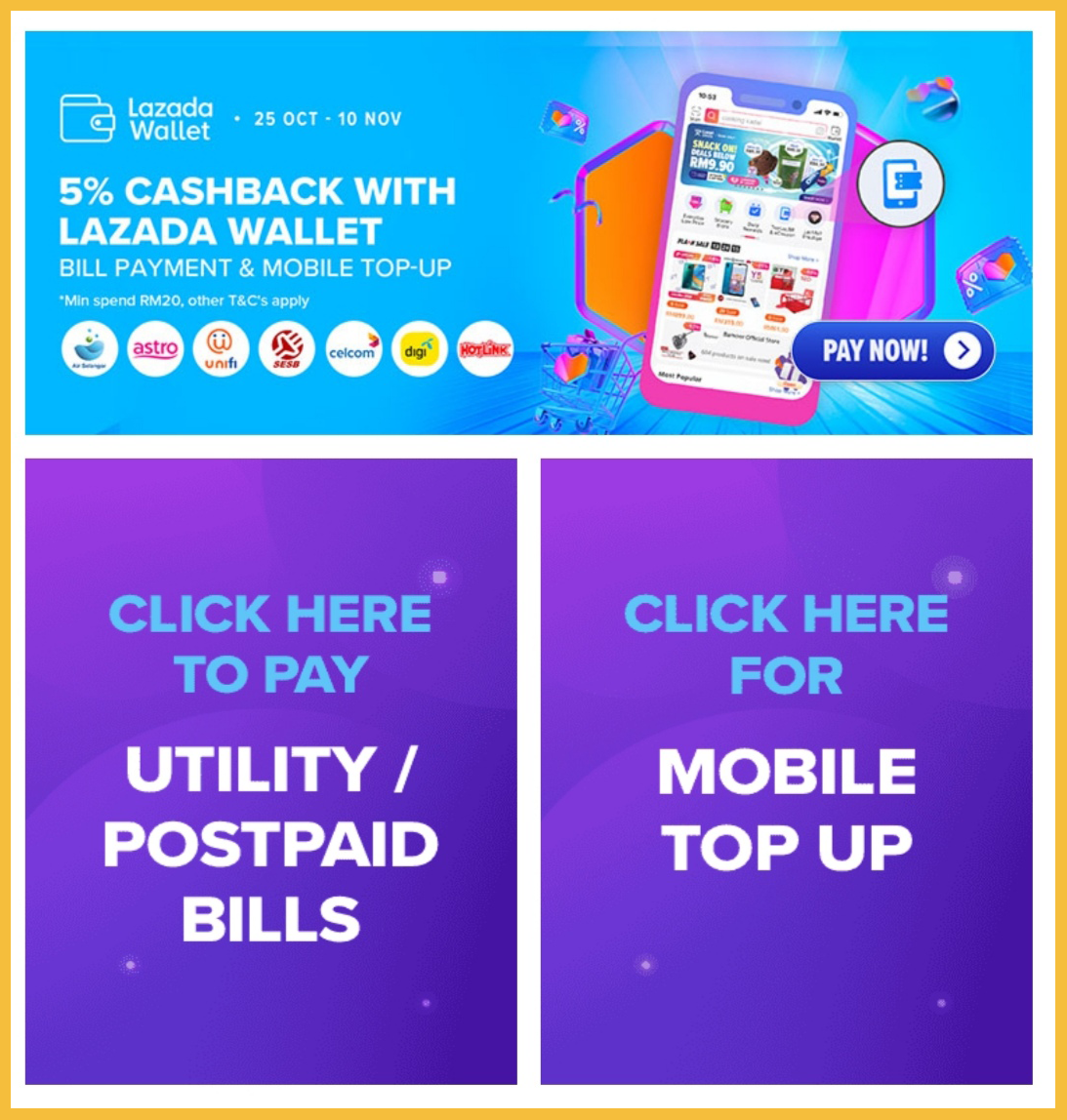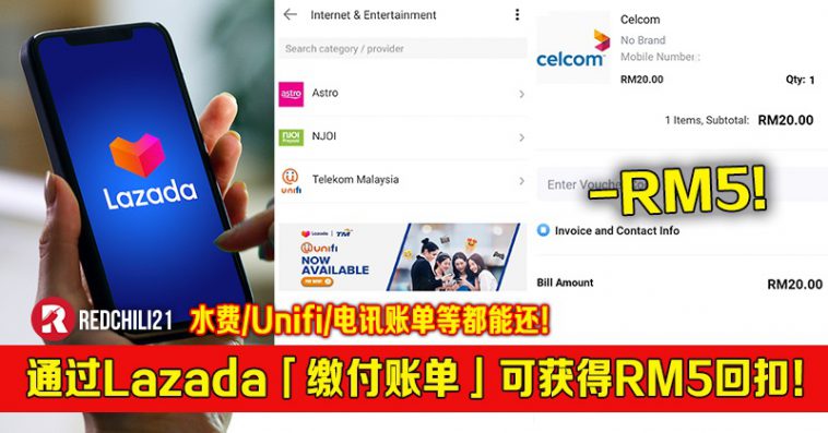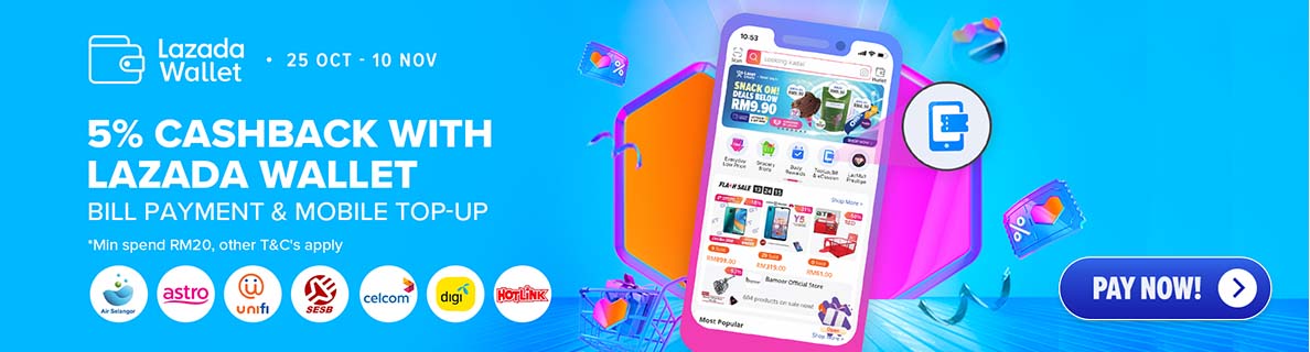 这项优惠将从即日起至11月10日,大马网购平台Lazada 推出缴付账单可获得5%回扣!最低缴付RM20 可获高达RM5 回扣!