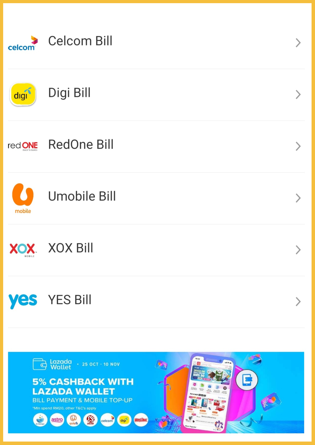 步骤4:选择你的电讯公司。比如:选择“Celcom Bill”