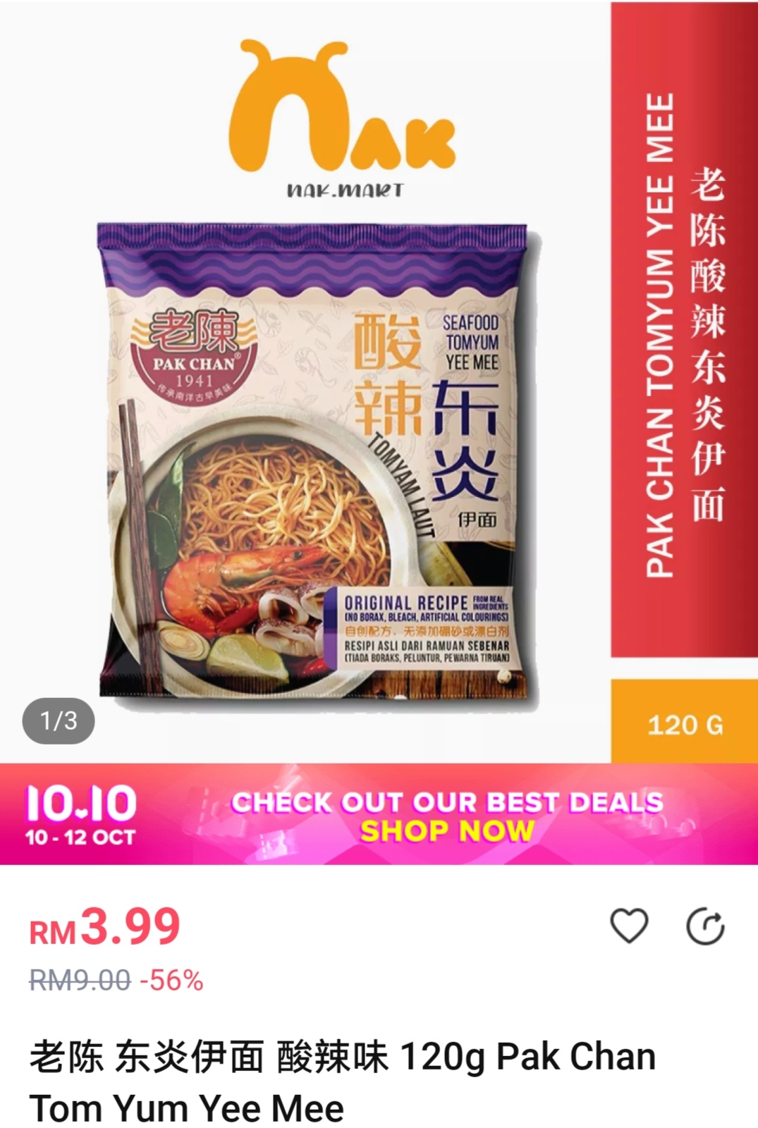 ▼ 4包老陈东炎伊面(原价RM15.96)折扣RM5 +免邮券,只需RM10.96!平均一包只需RM2.74!