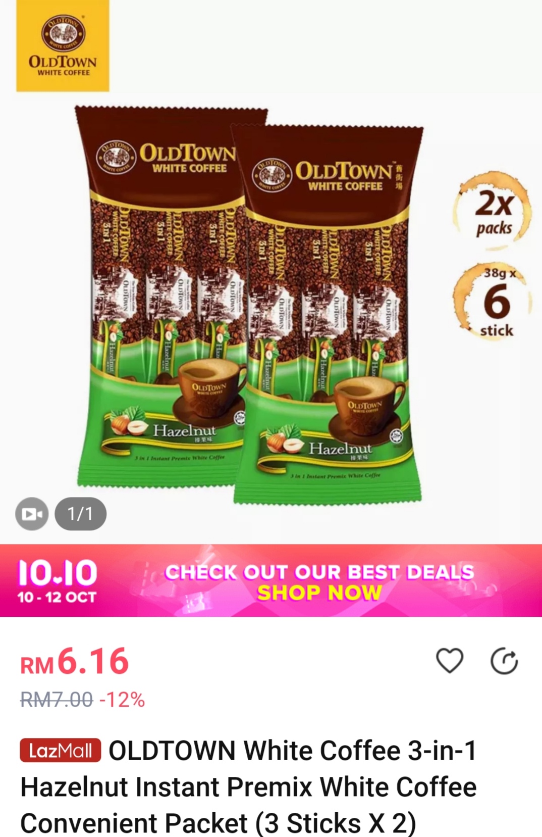 ▼ iii)OLDTOWN White Coffee 3-in-1 Hazelnut Instant Premix White Coffee Convenient Packet (3 Sticks X 2);购买【点击这里】