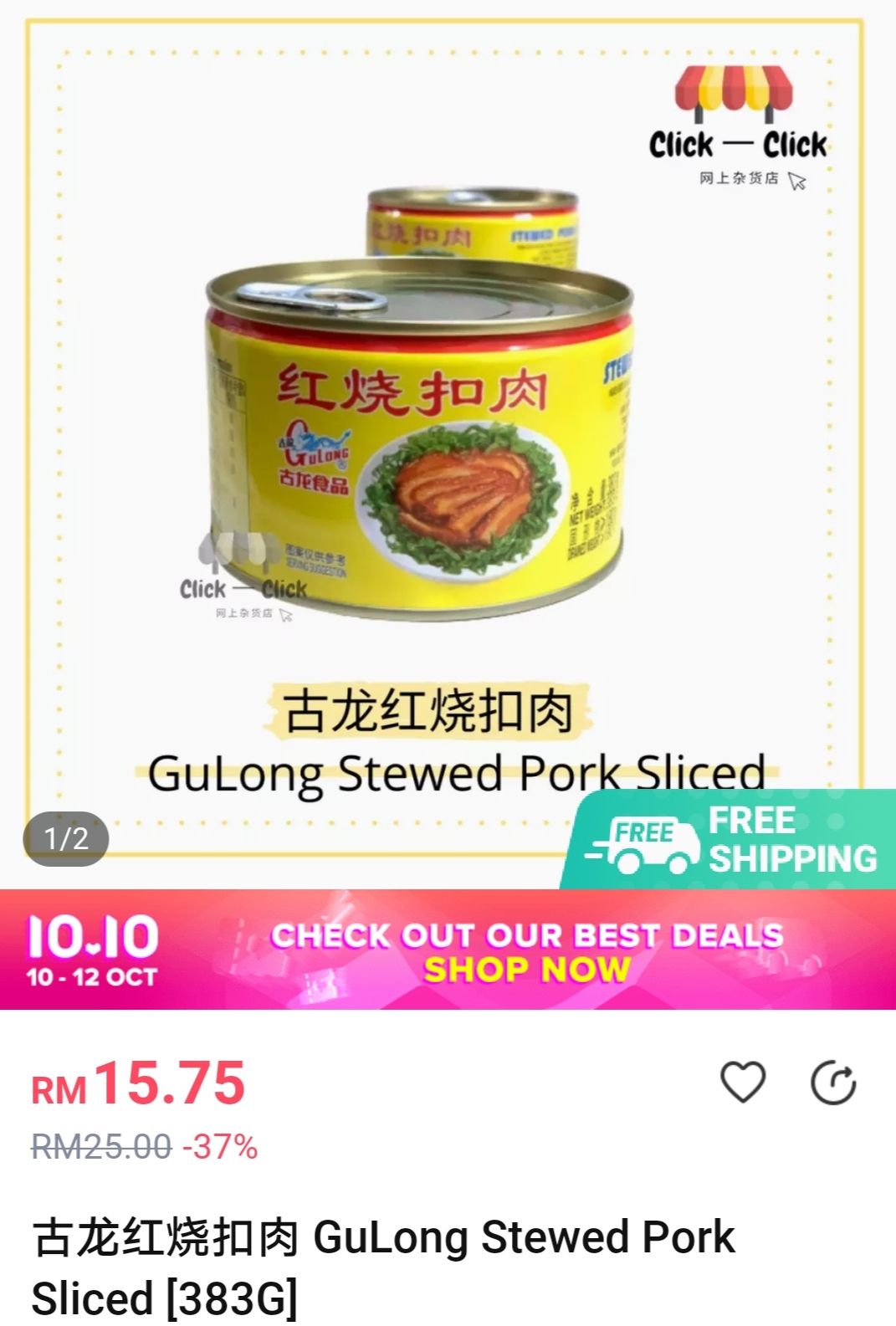 ▼1罐红烧扣肉(原价RM15.75)折扣RM5 +免邮券,只需RM10.75!