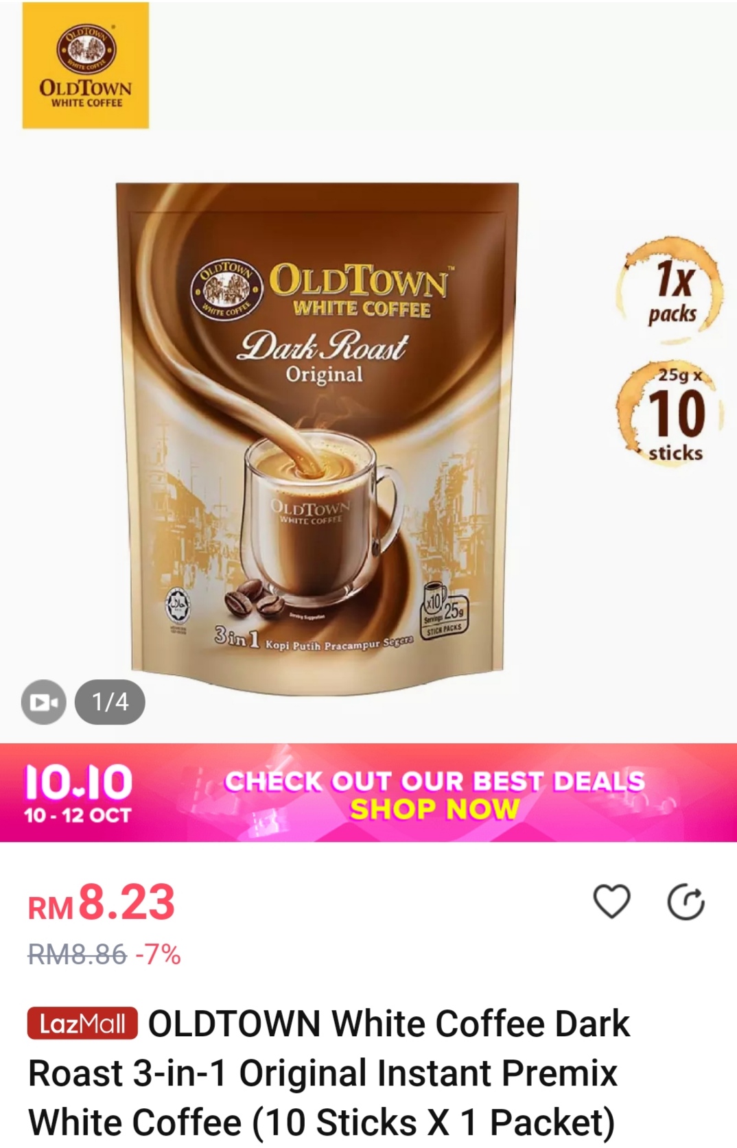 ▼ i)OLDTOWN White Coffee Dark Roast 3-in-1 Original Instant Premix White Coffee (10 Sticks X 1 Packet);购买【点击这里】
