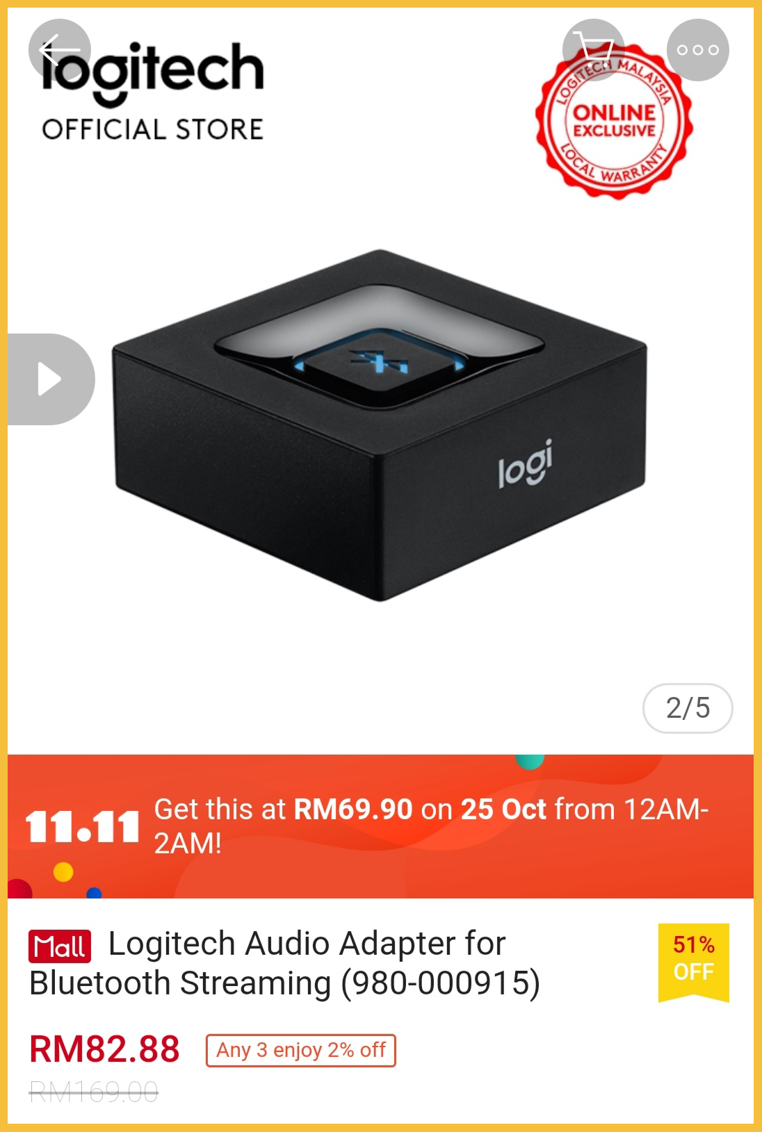 ▼⑫ Logitech Audio Adapter for Bluetooth Streaming【折扣59%】 – RM169 RM69.90(10月25日限时优惠)