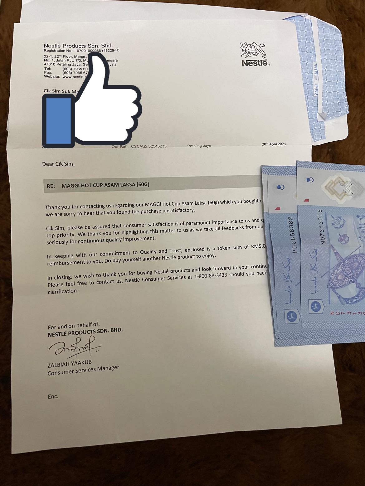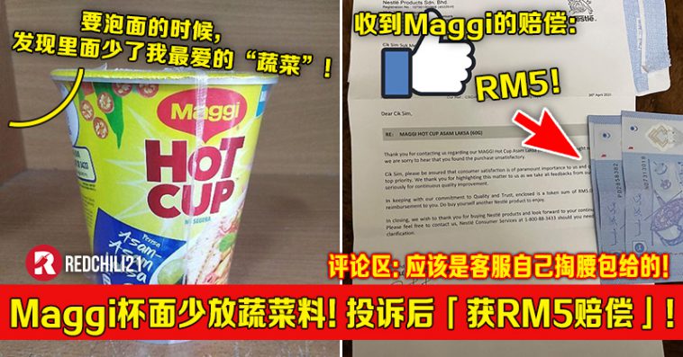 没想到几个月以后,女事主竟然收到了来自 Maggi 公司的赔偿—— RM5!她最后解释说:「本人是买过好几次都遇过这样的问题才发的,大家不要没问题乱乱发 email 啊!」