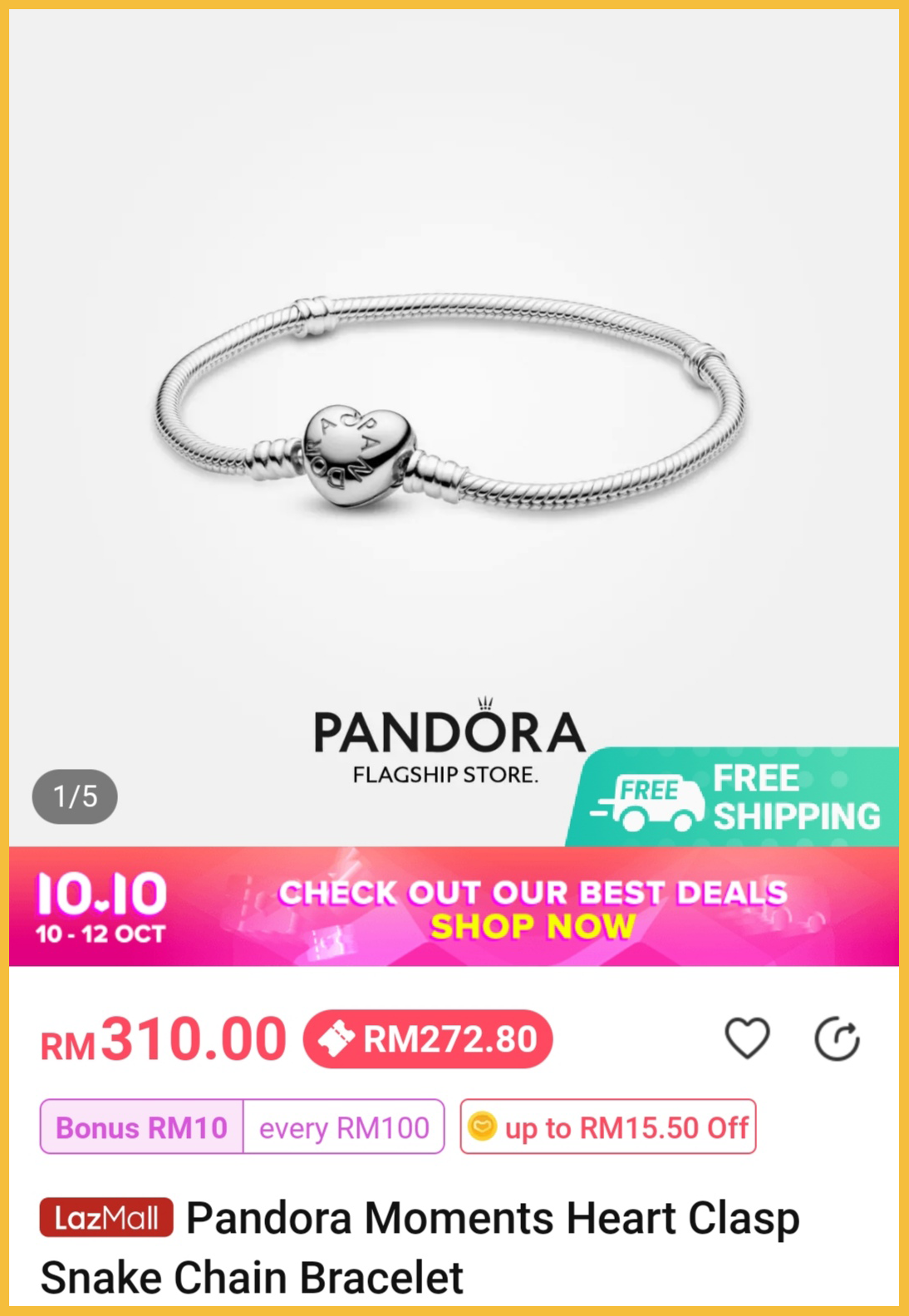 ▼ Pandora Moments Heart Clasp Snake Chain Bracelet – RM310 RM272.80(领取优惠券后折扣的价格)