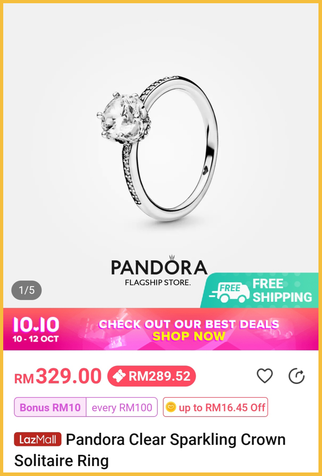 Pandora Clear Sparkling Crown Solitaire Ring – RM329 RM289.52(领取优惠券后折扣的价格)