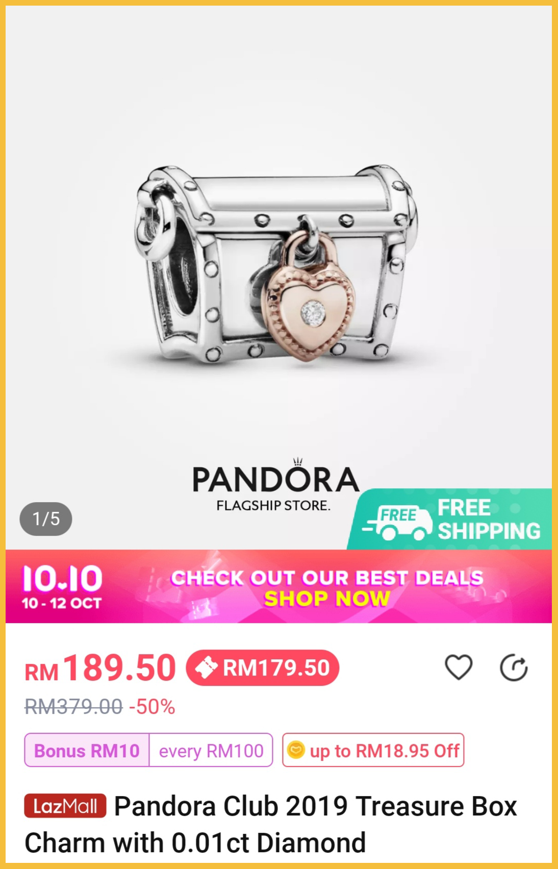 Pandora Club 2019 Treasure Box Charm with 0.01ct Diamond – RM379 RM179.50(领取优惠券后折扣的价格)