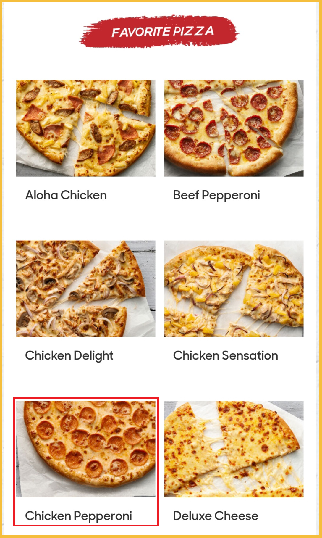步骤 4:选择你想要吃的披萨口味,例如:Chicken Pepperoni。