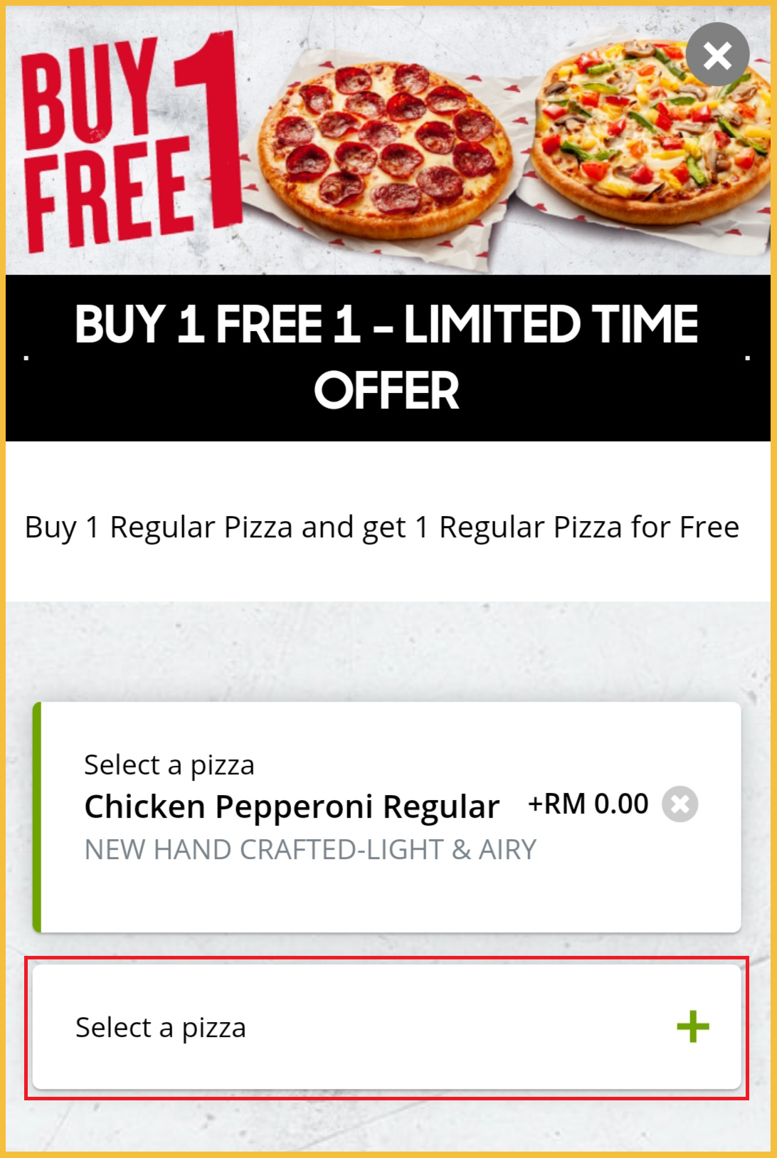只要你在Pizza Hut 官网订购1份 Regular Pizza 就可免费获得多一份Pizza!而且无需额外缴付外送费用!是免费的!