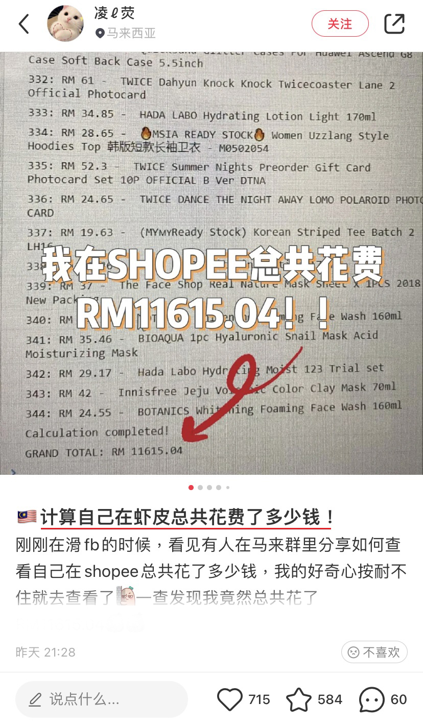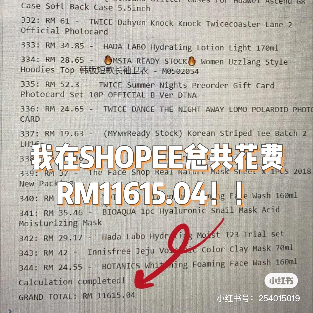 刚刚在滑 FB 的时候,看见有人在马来群里分享如何查看自己在 Shopee 总共花了多少钱,我的好奇心按耐不住就去查看了一查,发现我竟然总共花了RM11,615.04!