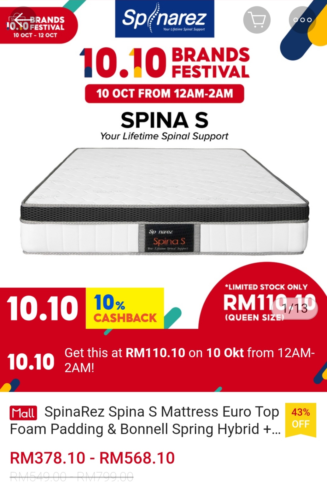 ▪ SpinaRez Spina S Tilam Mattress Euro Top Foam Padding & Bonnell Spring Hybrid + Coconut Fiber (10″) Queen – RM699 RM110.10