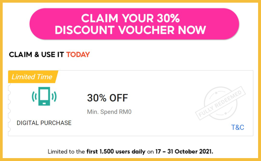 ※ 优惠期间的每日12am 开始领取优惠券(直到兑换完为止)!仅限首1500 位用户可获得此优惠券,先领先得!【点击这里