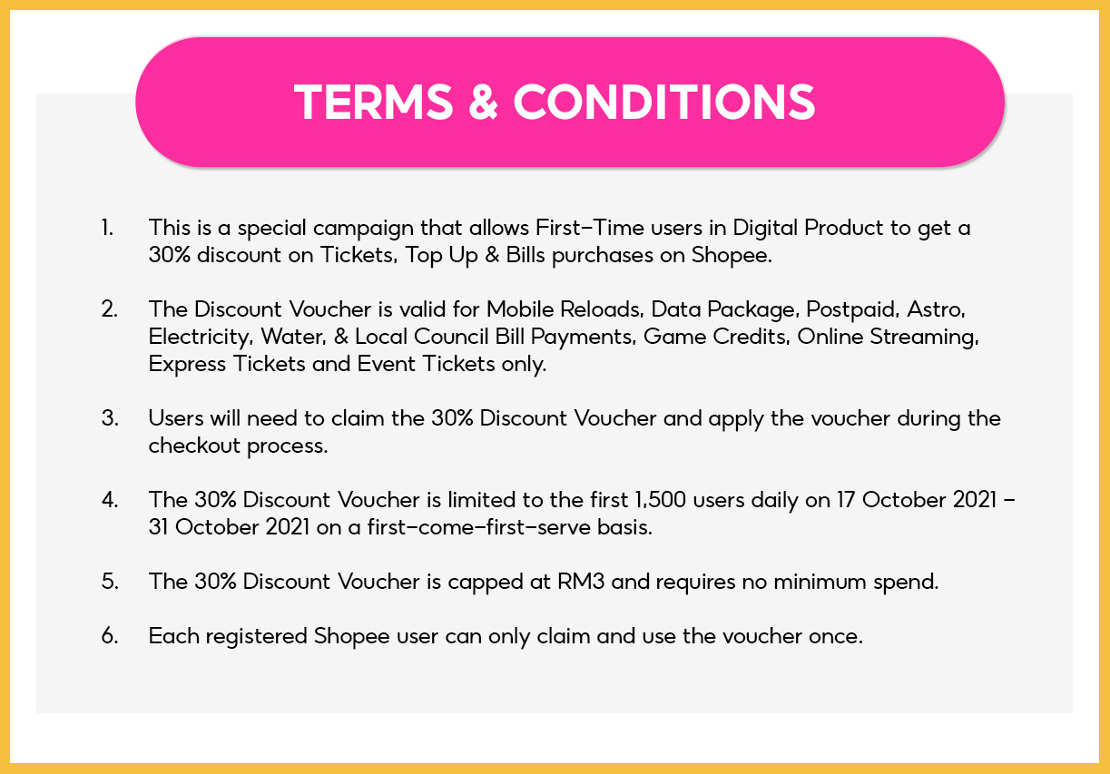 • 折扣券适合手机充值、网络配套、 Postpaid、Astro、电费、水费其他服务