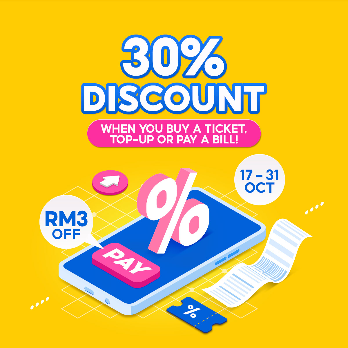 充值手机号码、缴付账单货购买入门票享有30%折扣(高达RM3)
