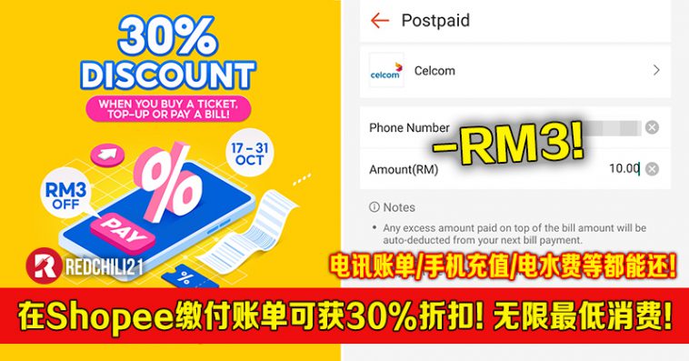在Shopee缴付账单可获得30%折扣!无限最低消费!电讯账单/手机充值/电水费等统统都能还!