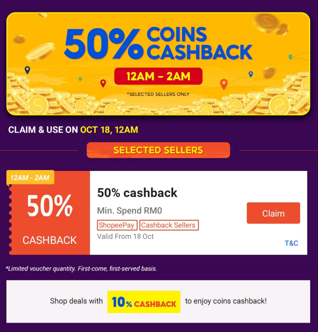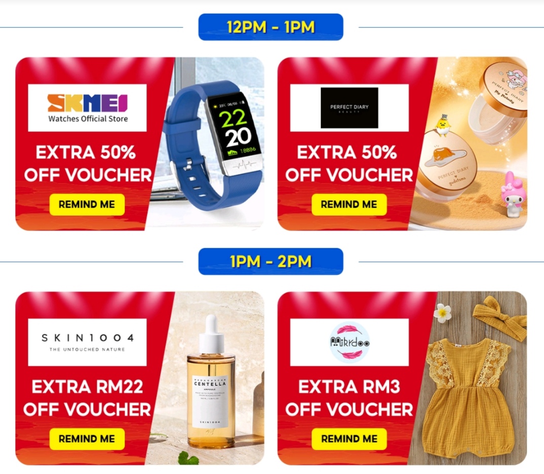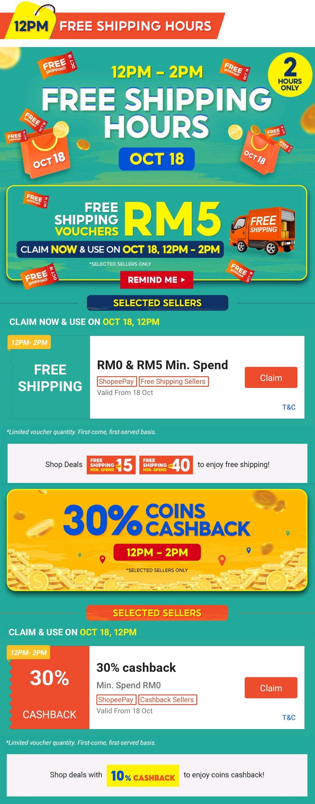 i)中午12pm 至2pm 可享有RM0 & RM5 免邮券 + 30%Shopee 币回扣券!限于指定商家!